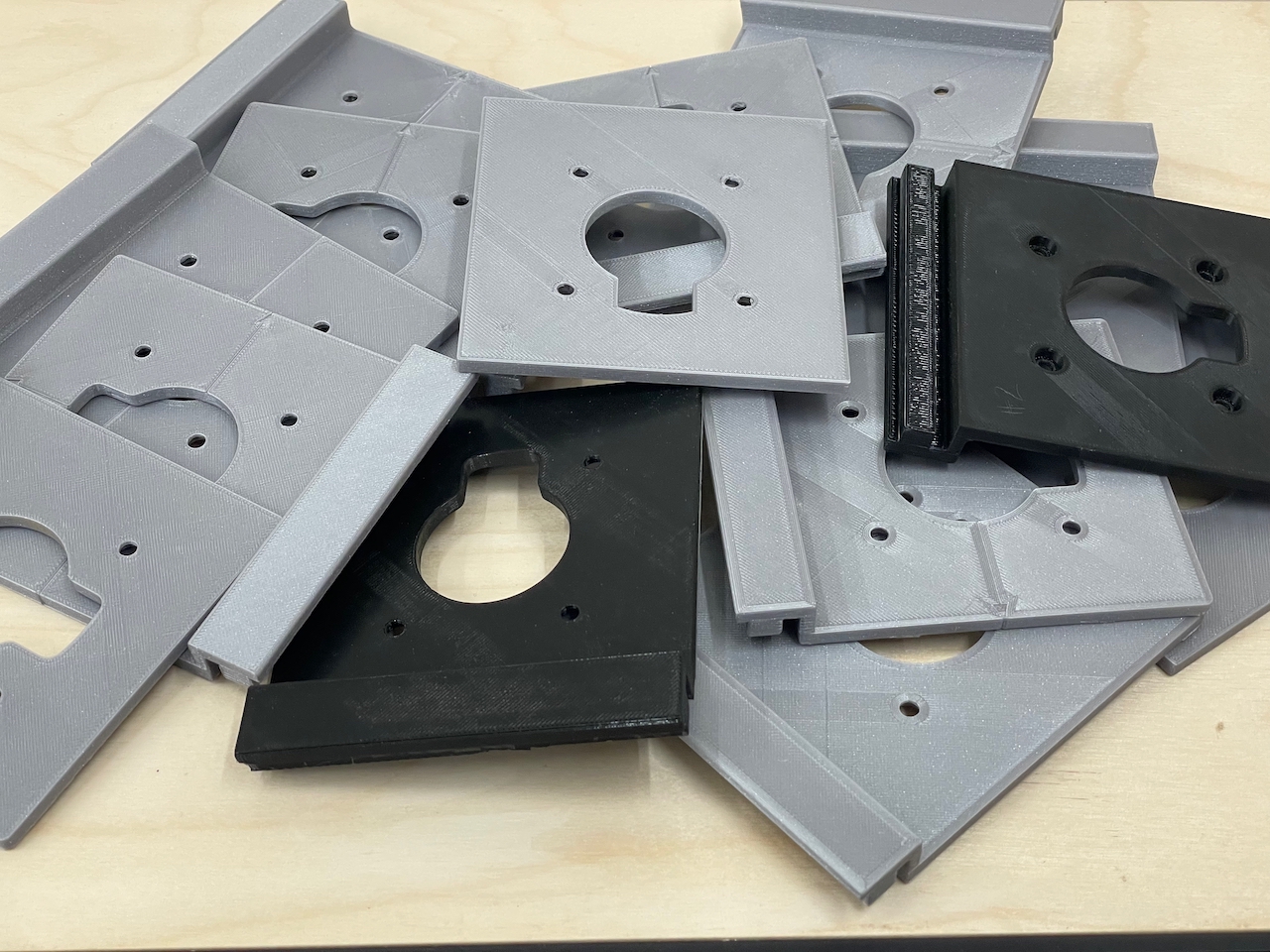 Optimizing the design for 3D printing took some trial and error. There needed to be a careful balance of tolerances tight enough to enable smooth and straight movement, while also taking into account the variances of the 3D printing process. The optimal print orientation for a smooth and clean rail profile would be vertical, but this would give the bottom of the plate a rougher finish and cause filament drooping issues in the screw holes and opening.