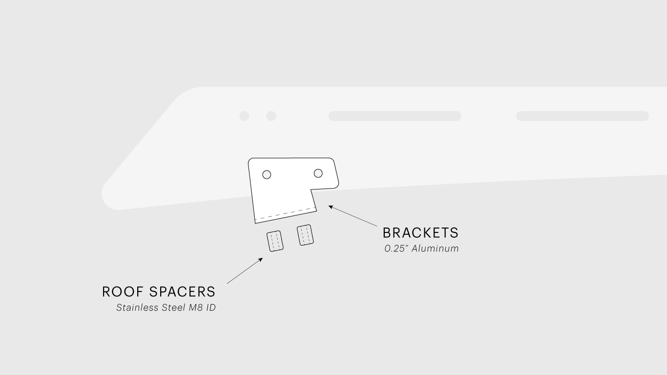 To avoid the brackets resting directly on the roof and scratching its paint, heavy duty spacers were required to bridge the gap between the brackets and the 1/2" deep "rain gutters" that run along each side of the roof. The gutters are filled with rubber strips, which had to be temporarily removed to drill out holes for the spacers to pass through. M8 bolts screw everything together directly into the roof.