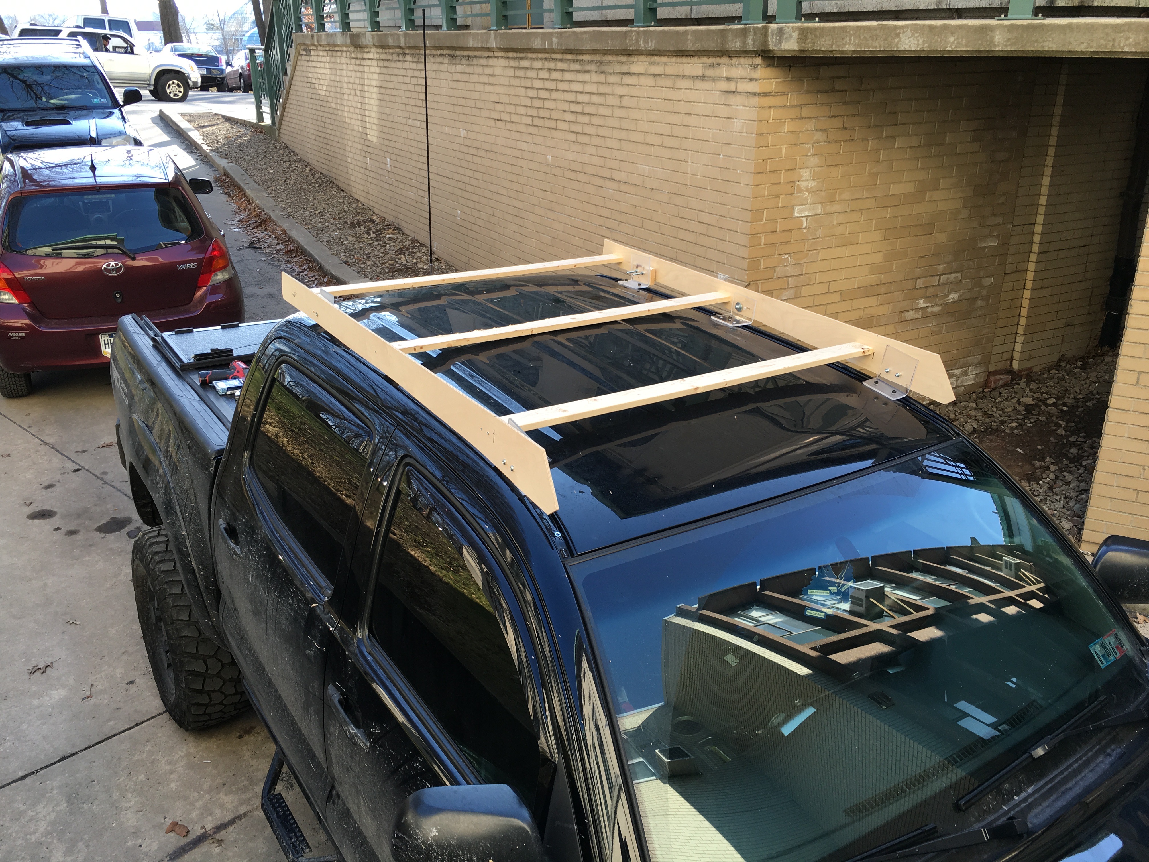 I wanted the rack to sit as low as possible, so accounting for the curvature of the roof was critical. I fabricated a full scale mockup using plywood side panels, 1x3 furring strips as crossbars, and mounting brackets made from acrylic which were quickly bent into shape with a MAP torch. This process really helped me dial in on the optimal dimensions and identify potentilly problematic aspects of my design. The center crossbar, which is at the apex of the roof, ended up offset about 12mm from the roof - enough clearance to allow for a reasonable amount of deflection under heavy load.