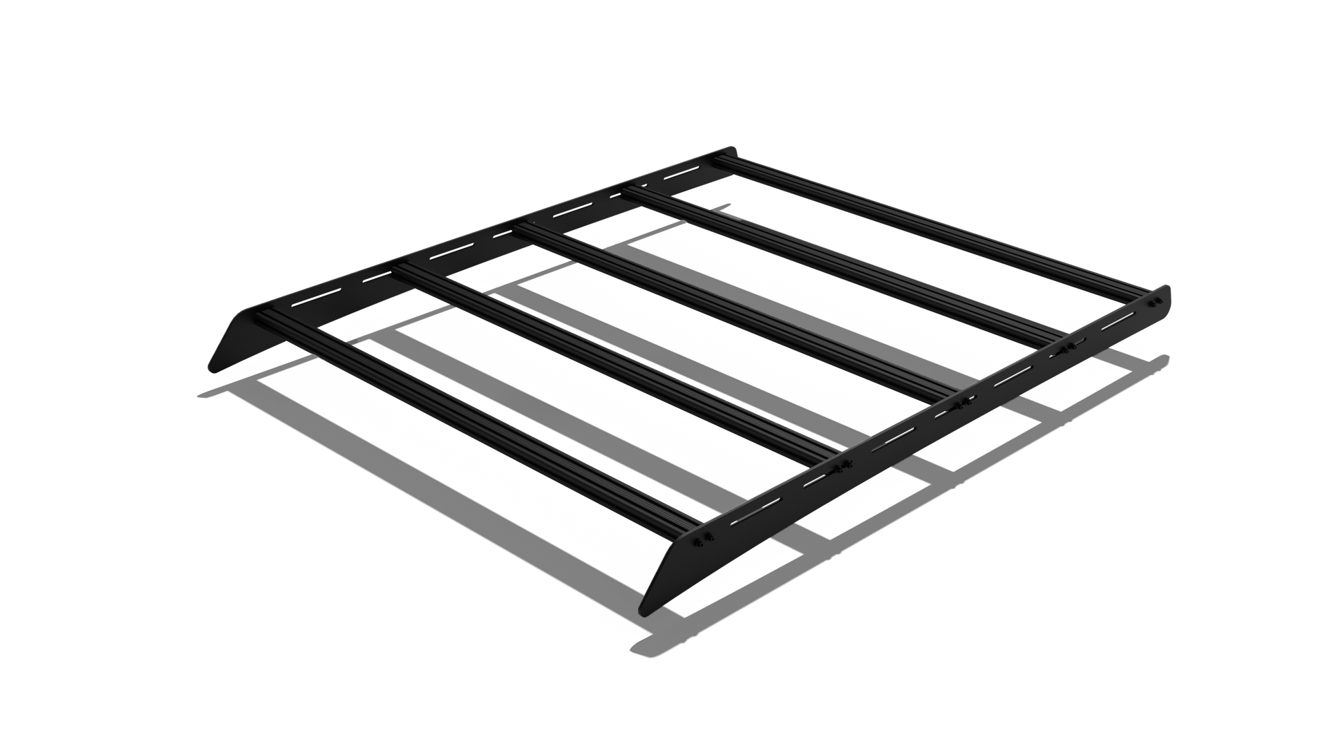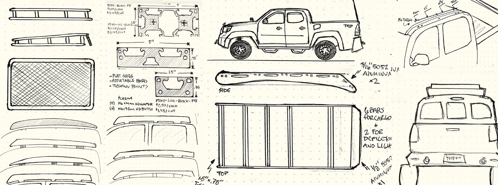 Unsatisfied with the aftermarket roof rack offerings for my Toyota Tacoma, I decided to design my own. Most of the racks out there were either too tall/clunky for my taste, or lacked the utility I was looking for. The final product is constructed of two aluminum side panels connected by aluminum extrusion cross bars.