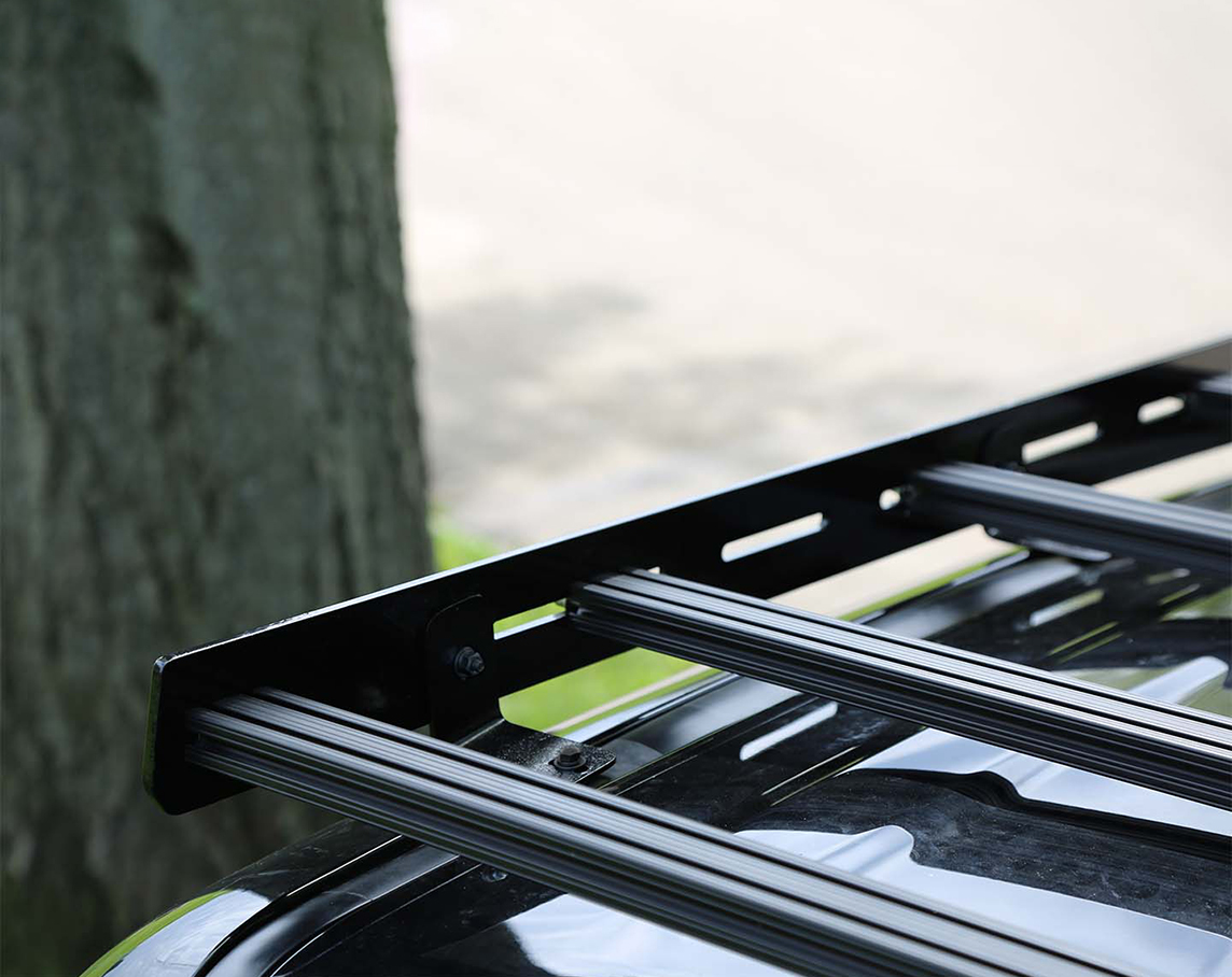 The crossbars are 1" x 2" black-anondized structural aluminum extrusions with t-slots on all 4 sides. A range of nuts, bolts, and brackets can be fastened in the slots, allowing for easy off the shelf or custom made mounting and tie-down solutions. I tapped the ends to receive two 1/4"-20 bolts (with washers) on each side to secure them to the side panels.