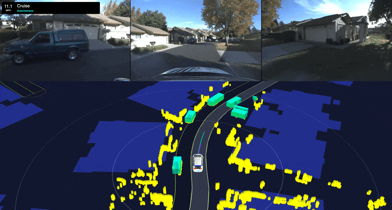In this example, the vehicle comes upon a narrow street with other cars illegally parked on both sides of the road. The vehicle identifies this as a potentially hazardous situation and comes to a gentle stop while pinging a teleoperator for help. A teleoperator briefly takes control to navigate past the hazard. Once clear, the vehicle re-enters autonomous mode and continues the ride.