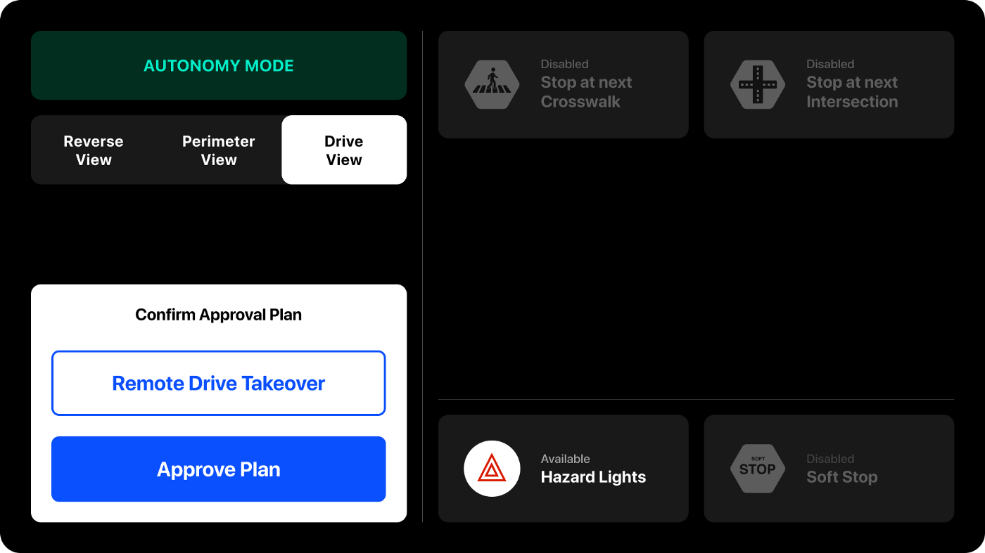 The vehicle command screen gives the teleoperator control over vehicle behavior. It allows them to review route or motion plan changes, instruct the vehicle to stop or pull over, and take over complete control of the vehicle when needed. Teleassistance can be requested by the passenger or by the vehicle itself.