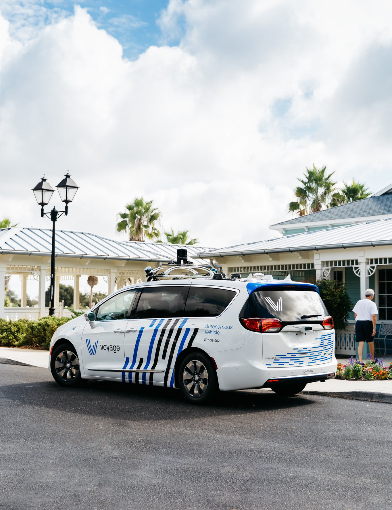 The teleassist pod is outfitted with seating and controls identical to those found in Voyage's Chrysler Pacifica vans housed on a robust, heavy chassis. This familar feel lets operators immediately leverage their experience driving the real-life vans so they can focus on making quick decisions and operating safely. A curved front/side camera display and rear-view mirror display furter immereses the operator into the scene. To the left a large touch display presents actionable prompts and autonomy commands.